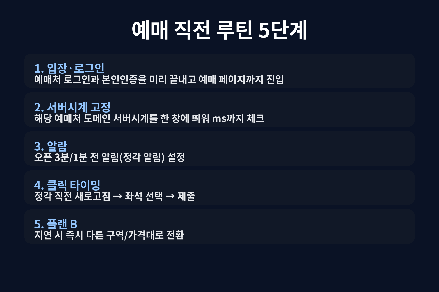 팁: 예매 직전에는 한 가지 시계를 고정해서 보세요(탭을 여러 개 띄우면 시차 보정 체감이 달라질 수 있음).