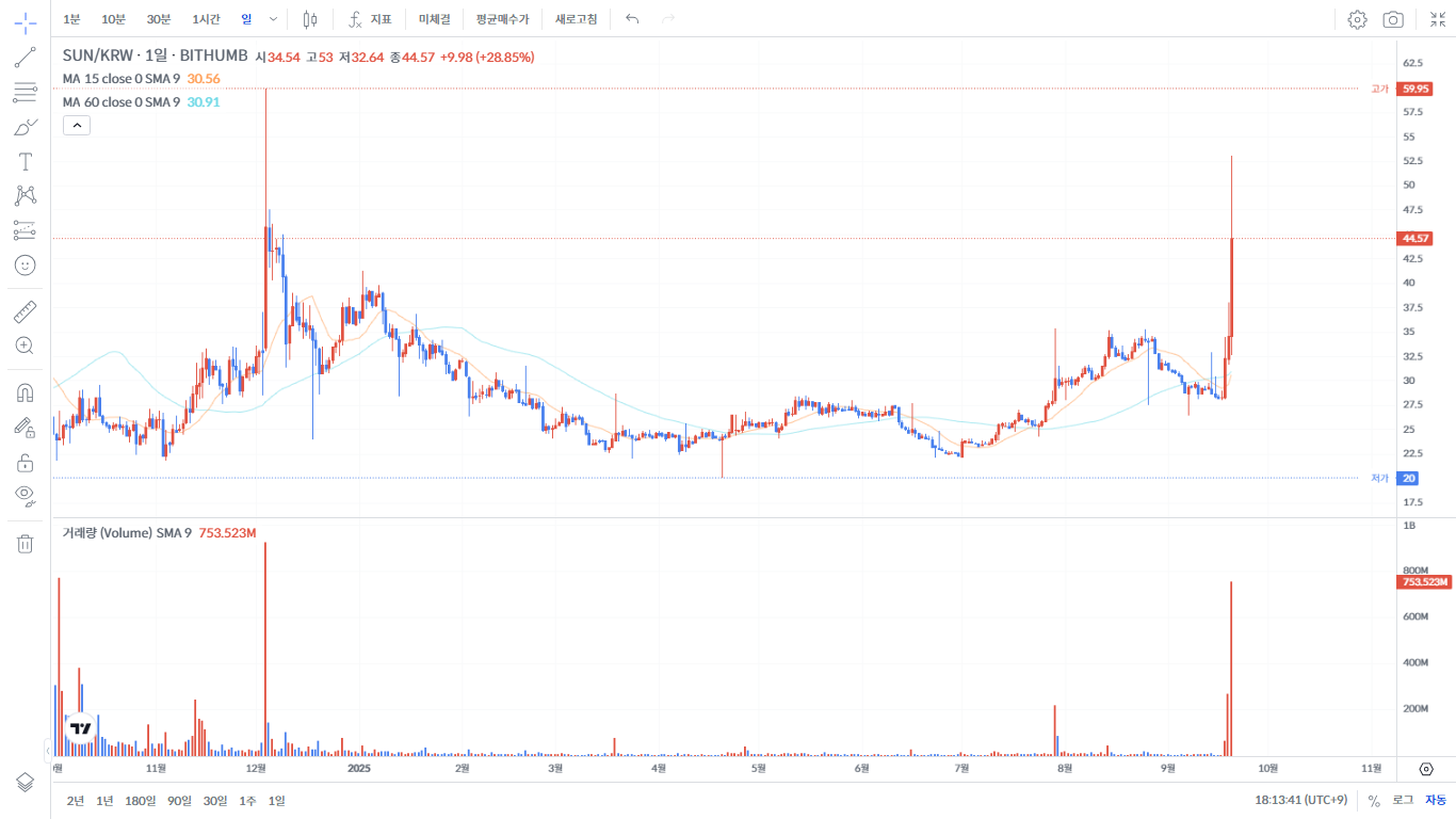SUN 코인은 TRON 기반 DeFi의 핵심 토큰으로, 최근 일봉에서 역사적 거래량 급증과 함께 박스권 상단에 근접했습니다. 현재는 **피보나치 저항 구간(45~52원)**에서 매물 소화 여부가 중요하며, 60원 돌파 시 100원까지의 추가 상승 여력이 열립니다.