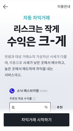 - 방식: 사용자가 목표 수익률/주문금액/대상 코인을 설정 → 시스템이 자동으로 차익거래 시도