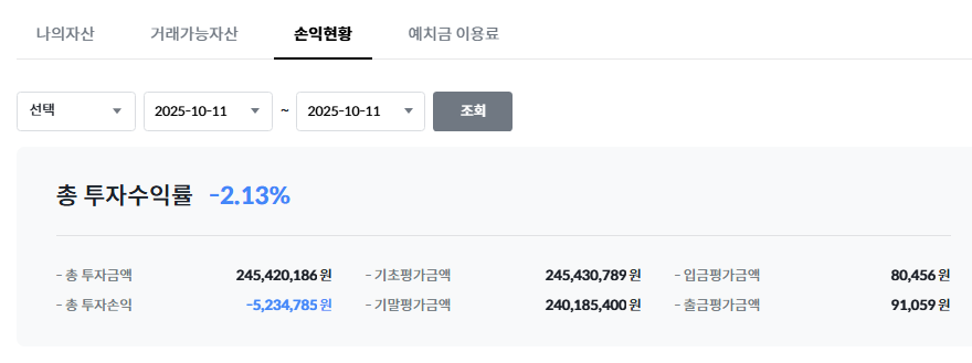 이 급락에서 현물계좌 약 523만 원 손실(-2.13%) 이 발생했지만,