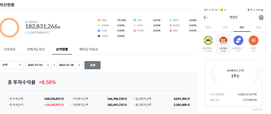 이번 7월, 저는 단일 종목 집중이 아닌 분산된 포트폴리오 전략과 SHIB 거래왕 대회 참여를 병행하여 총 약 2천만 원의 수익을 올렸습니다. 분산 전략이 자금 효율과 리스크 관리를 동시에 해결해주었고, 이벤트는 수익률을 더 극대화해주는 좋은 기회가 되었습니다.